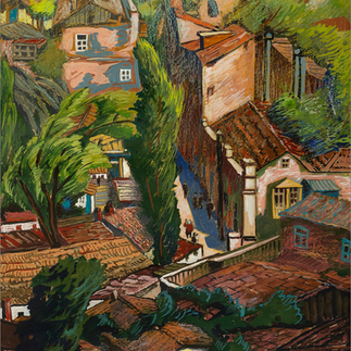 Podczas gdy Pirosmani malował wiejską przeszłość, Elene Akhvlediani (1898–1975) skierowała swój wzrok ku miastu — a konkretnie ku staremu Tbilisi. Kształcona w Moskwie i Paryżu, Akhvlediani łączyła francuski postimpresjonizm z gruzińskim liryzmem, tworząc żywe miejskie sceny pełne koloru, nostalgii i harmonii kompozycji. Jej obrazy krzywych balkonów, brukowanych ulic i słonecznych dziedzińców oddają ducha miasta, które jest jednocześnie starożytne i nieustannie zmieniające się.